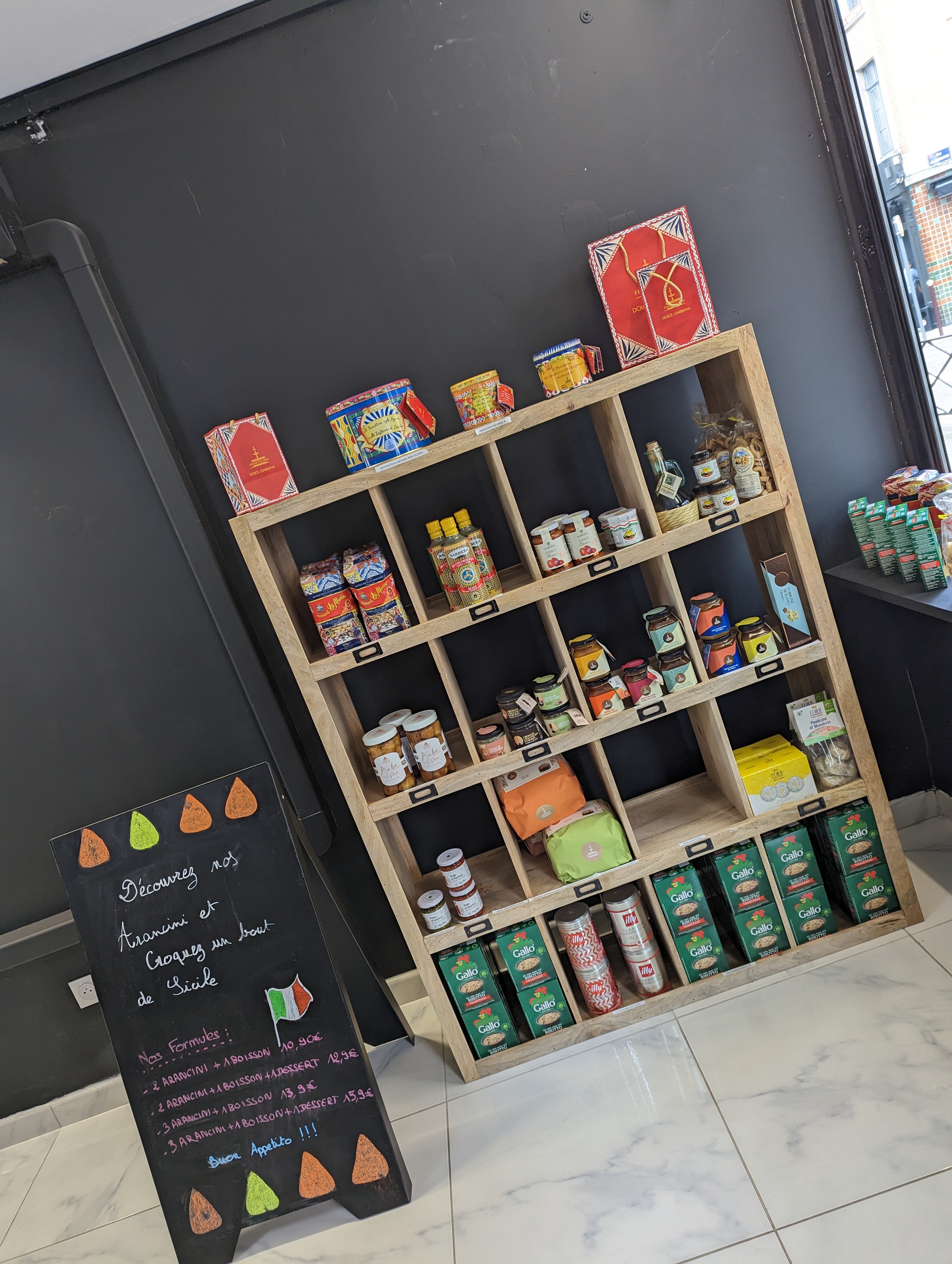 Les + : Un très bon accueil et des explications claires. Des produits de qualité et du fait maison. Très bien emballés (à emporter) avec même la proposition de les réchauffer avant. Arancinis délicieux, deux arancinis suffisent pour être calé. Celui au Gorgonzola & Noix est vraiment délicieux, mon préféré ! Une petite boutique sympathique dans Lille pas loin du parc de la Citadelle proposant des produit typiques. Les - : Le prix, 16€ les 4 arancinis qui sont certes excellents mais cela rebute à revenir plus souvent malheureusement. Les horaires d’ouverture réduites. J’ai tenté de venir plusieurs fois et c’était toujours fermé donc j’ai dû m’adapter pour venir en fin de journée juste après le travail. Dommage qu’il ne restait plus beaucoup de choix à 19h00. Je recommande cet établissement pour la qualité des produits.