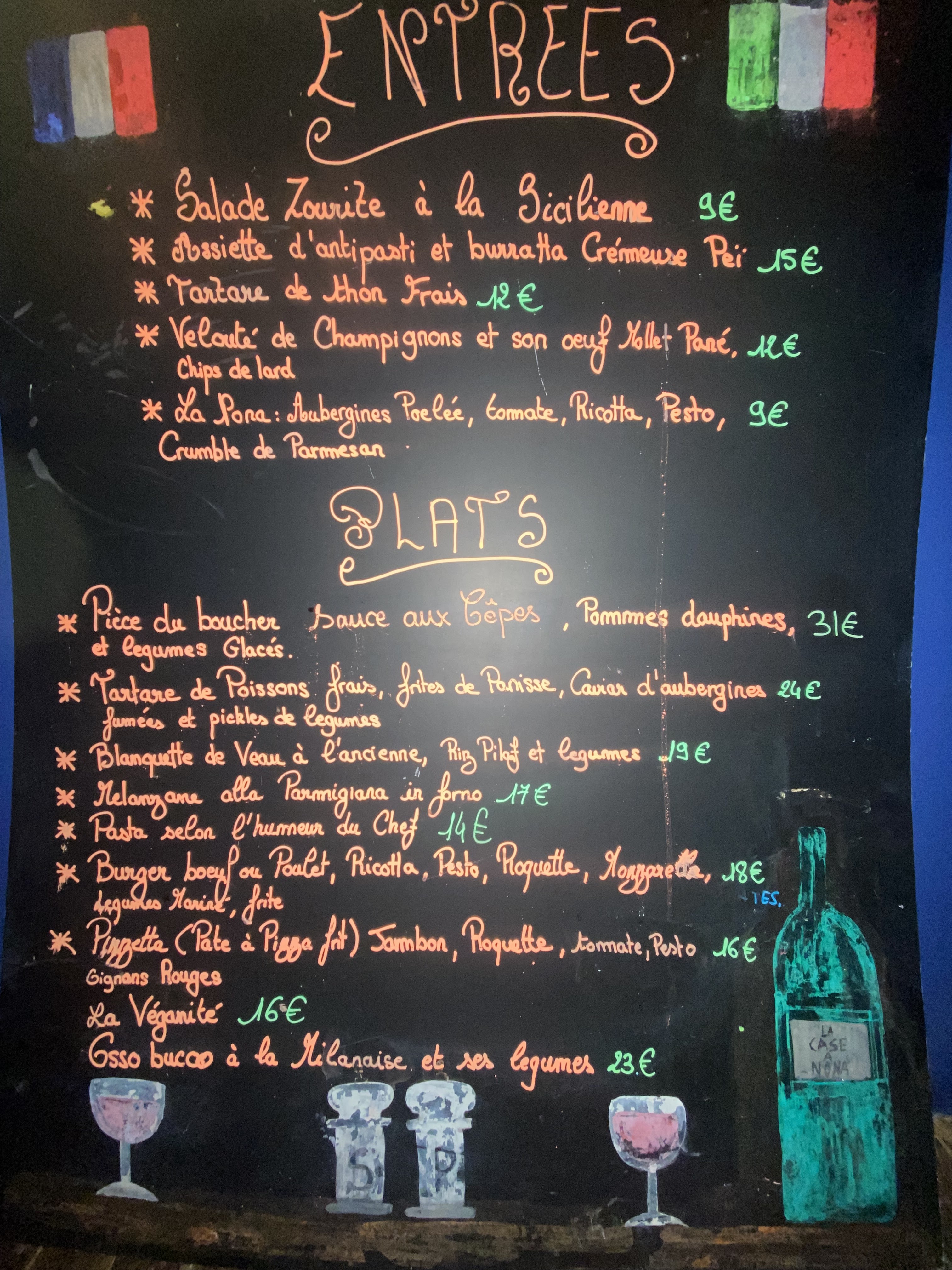 Malgré la pluie, restaurant cosy, carte simple qui sent bon la Sicile, excellente recommandation pour le vin, a un prix raisonnable et le shaker vodka eau de coco pour conclure était parfait. Merci à l équipe très sympa.